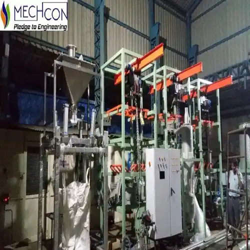 Electric big bag unloader (440V) with 2 kW power. Capacity 500-2500 Kg. Features 20-40 ft lifting height and 600x1600 mm platform. Fixed type, 12-month warranty.