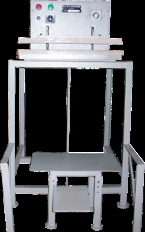 This electric, single-phase impulse sealing machine operates at 220V. Features a silver, color-coated finish for durability and a large sealing paddle for efficient operation.