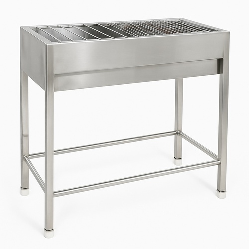 Portable silver stainless steel charcoal grill, size 30 X 15, designed for restaurant use. Durable construction for commercial applications.