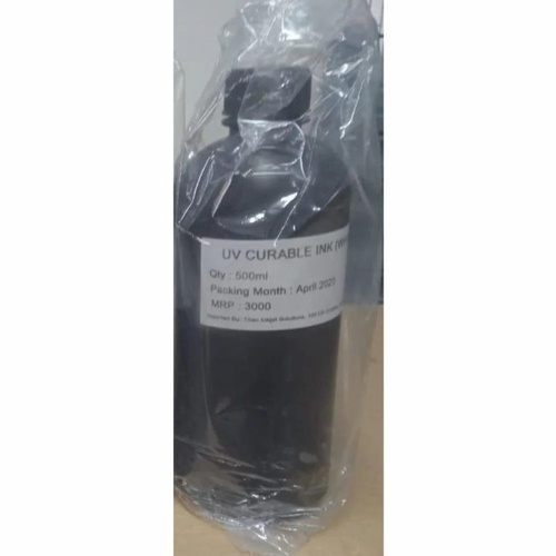 Black 500ml bottle of ultraviolet ink for printing applications. Shelf life of 1 year. Minimum order is 1 bottle.
