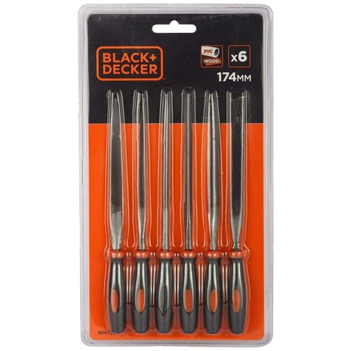 Black & Decker BDHT22148 needle file set. Features 6 files, each 174mm in length. Designed for precise shaping and finishing of various materials. Durable construction for reliable use.