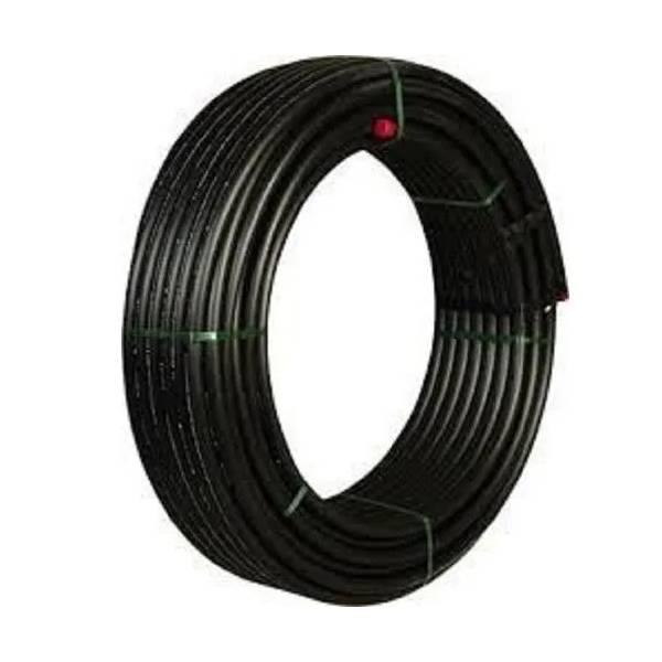 Black HDPE coil pipe, available in 32-90 mm diameter. Lengths range from 30-40 meters, with a flow rate of 2 liters per hour.