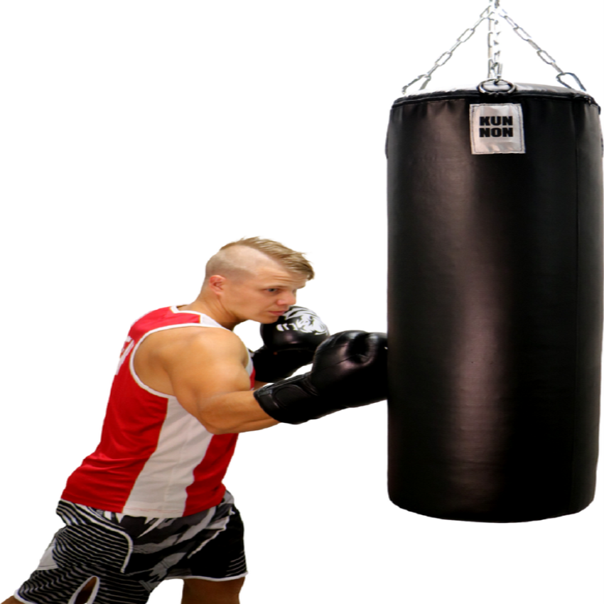 This cylindrical black leather punching bag is 24 inches, designed for boxing training. Durable construction ensures longevity for consistent workout sessions.