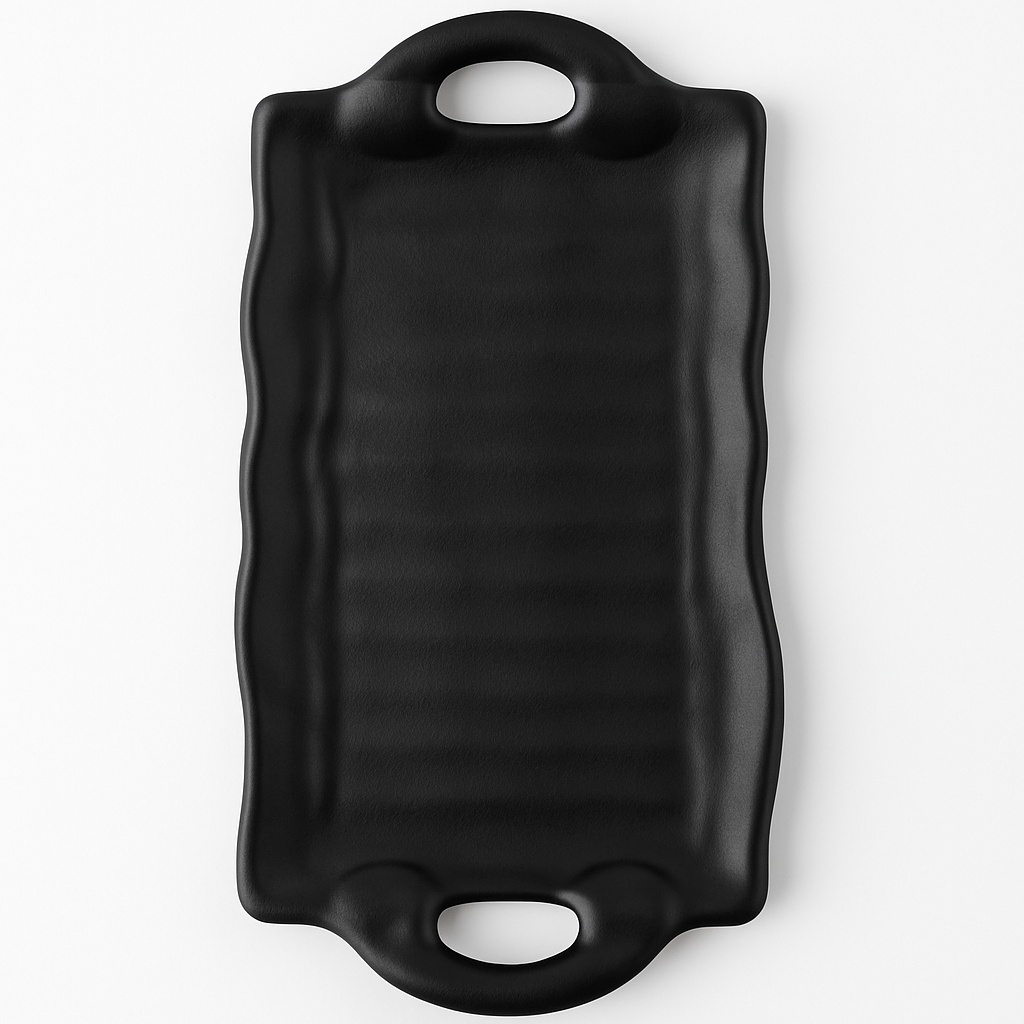 Durable 24x10 inch black melamine platter designed for hotel use. Ideal for serving hot food. Packaged in a box, minimum order quantity of 1000 pieces.