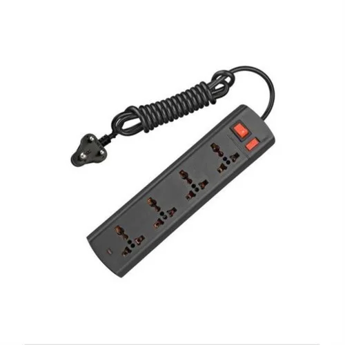 Black PVC power strip with 4 pins for electric use. Features durable PVC construction and a linked spike guard for protection. Ideal for various electrical applications.