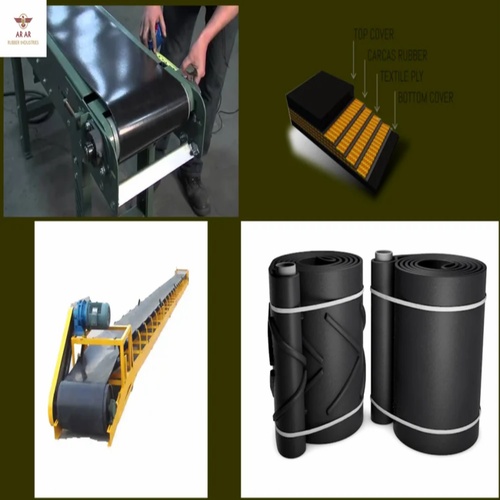 Black rubber general-purpose endless conveyor belt for stone crushers, cement, and coal applications. Available in various sizes and thicknesses up to 20mm.