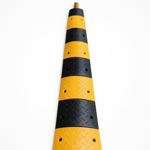 Black rubber speed breaker for road use. Constructed from durable rubber material for effective traffic calming. Enhances safety by reducing vehicle speeds on public roads.