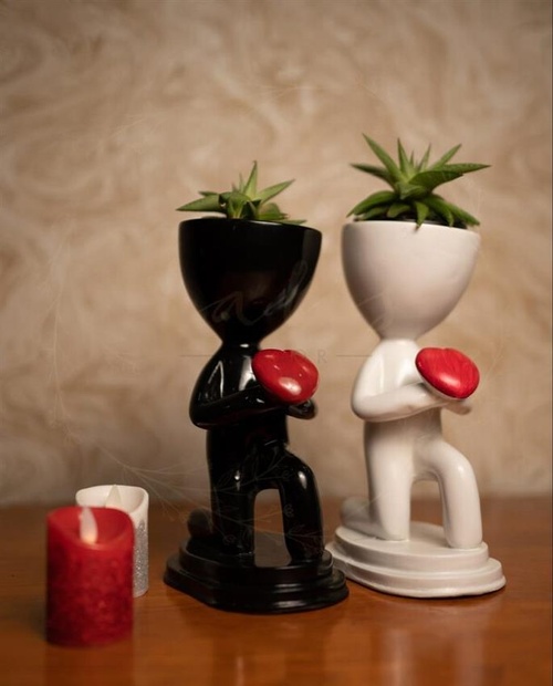 Round epoxy resin pot in black and white. Suitable for gardening with a color-coated finish. Packaged in a box. Made in India.