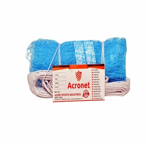 Durable blue nylon badminton net for playing. Features square holes and is packaged in a packet. Ideal for recreational and competitive play.