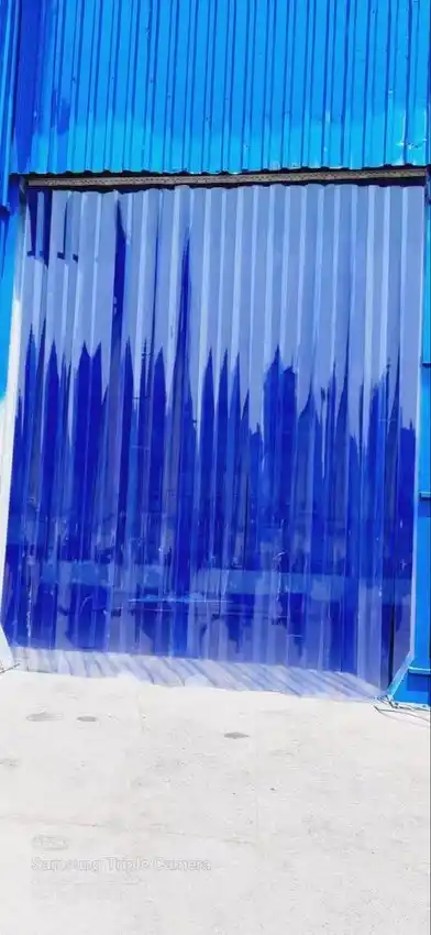 Blue PVC roll curtain for office use. Features 3 mm thickness and dimensions of 200 mm x 50 m (W x L). Plain pattern, Made in India.