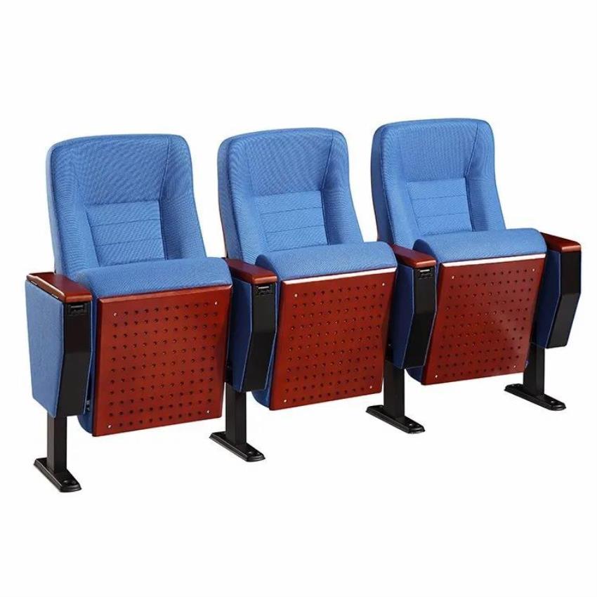 Corrosion-free blue auditorium chair with fixed arms. Features a stainless steel frame and foam filling for durability and comfort in public spaces.