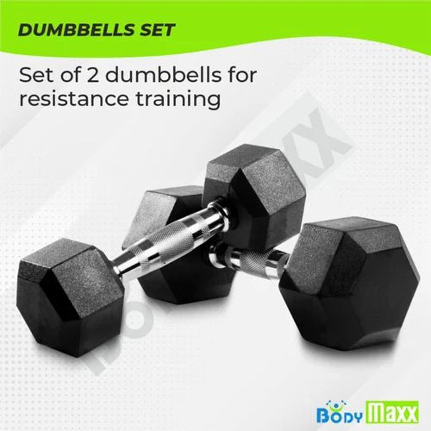 Fixed weight rubber hex dumbbells, 2-40 Kg. Durable rubber coating for gym use. Black color. Made in India. Minimum order 50 Kg.