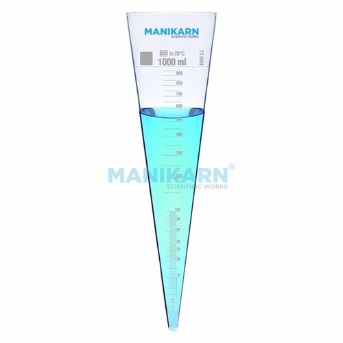 Borosilicate glass heavy-wall Imhoff cone with 1000 ml capacity. Transparent, conical design. Standard packing in Thermacoal and carton box. Made in India.