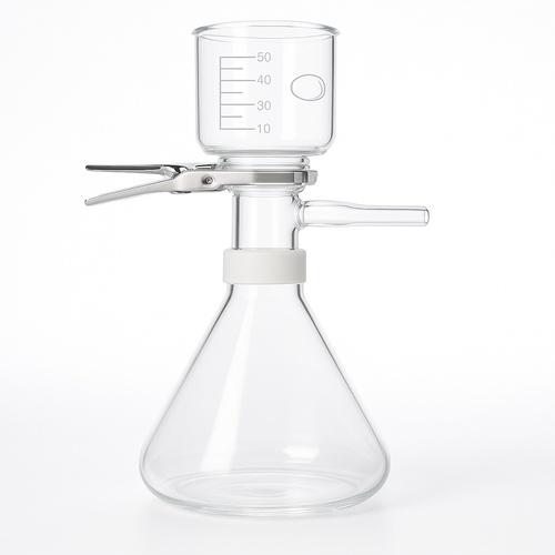 Borosilicate glass conical filter holder assembly for chemical laboratory use. Features a transparent 2 mm thickness and 12-inch height. Minimum order quantity is 5 units.