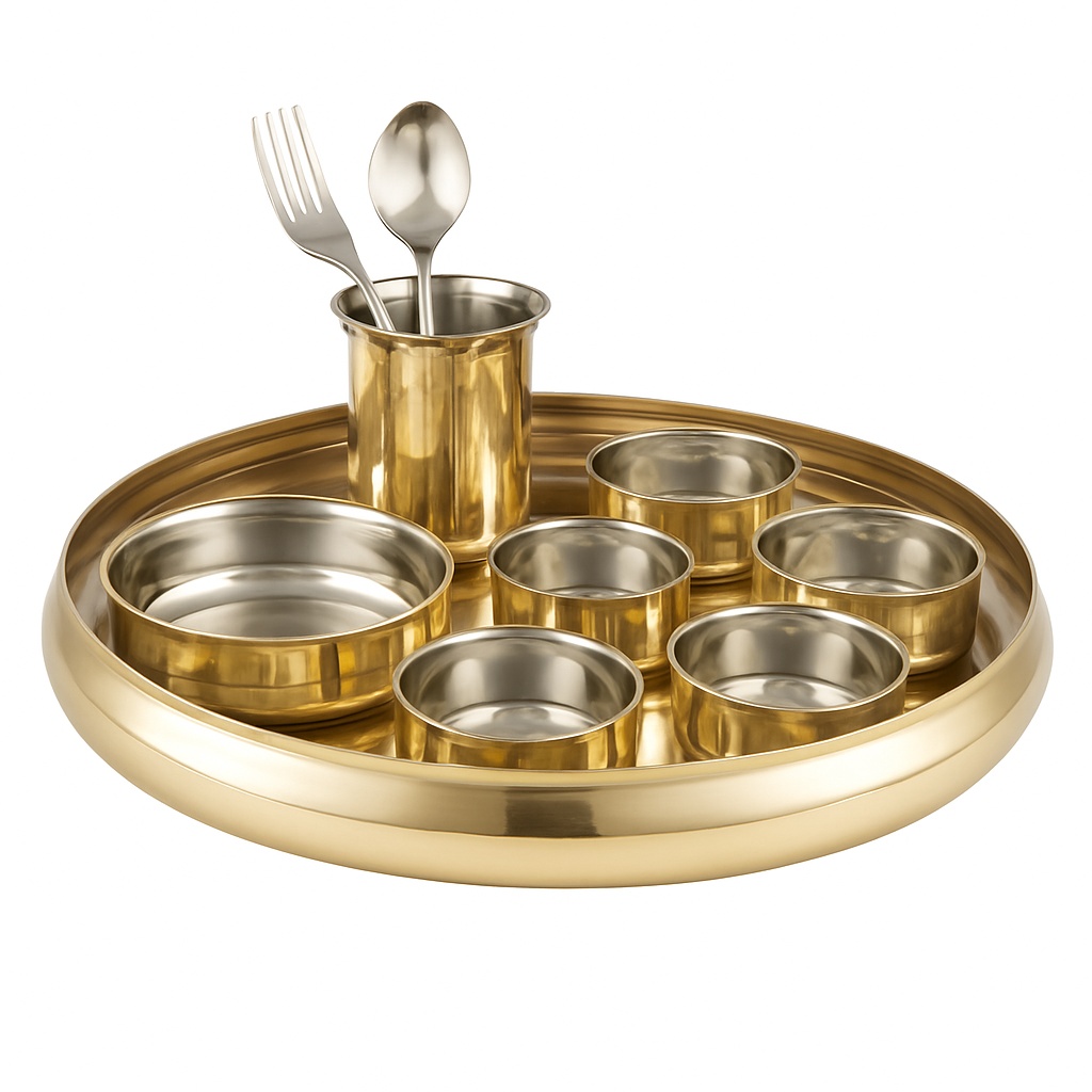 Authentic brass thali dining set. Designed for traditional Indian meals. Model name: Brass Thali Set. Specifications not detailed.