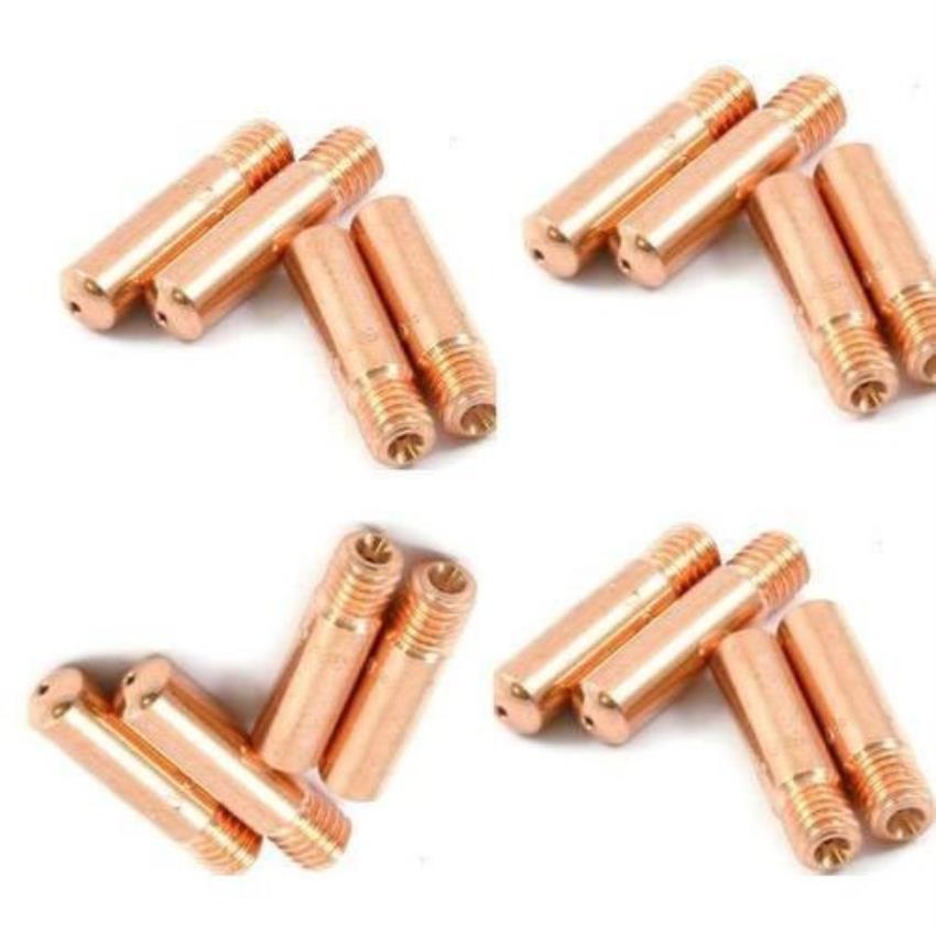Brass contact tips with finishing. Available in 0.8mm, 1.0mm, and 1.2mm diameters. Rated for 300-400A output current. Sold in packs of 10.