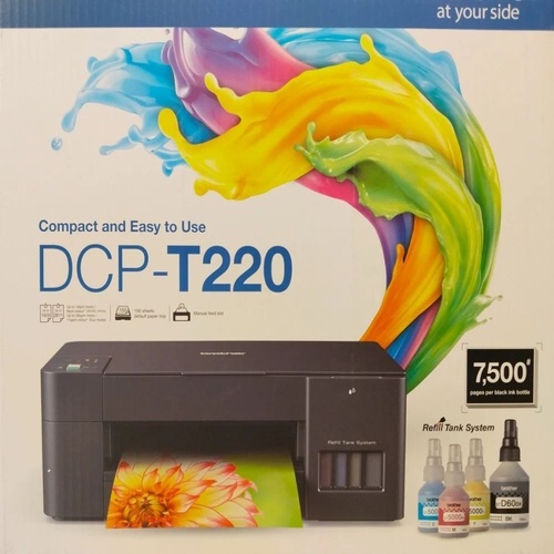 DCP-T220 ink tank machine with USB connectivity. Features Color/B&W output, A4 paper size, up to 30 pages/min print speed, and 50,000 pages monthly print volume. Supports Print, Scan, Copy functions.