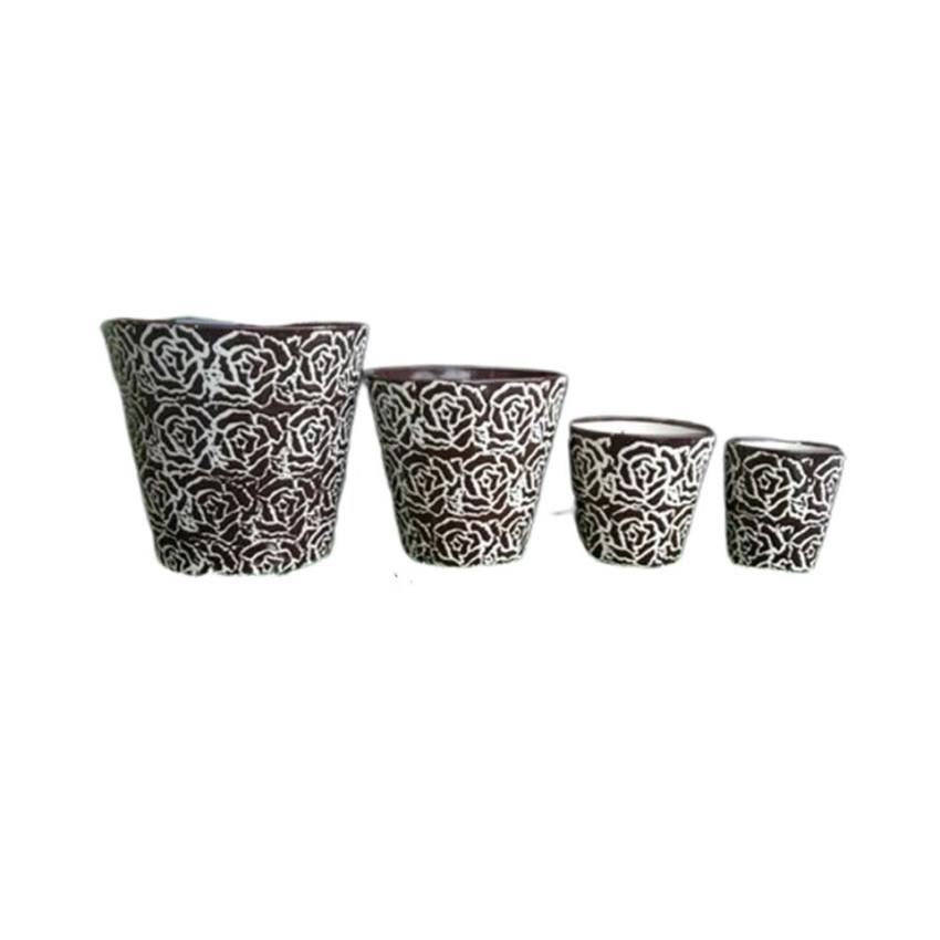 Set of round, brown ceramic pots featuring a printed floral pattern. Made in India, packaged in a box. Minimum order quantity of 100 sets.