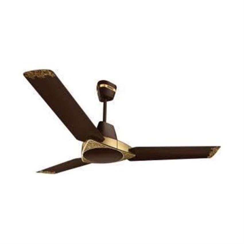 Brown luminous 3-blade ceiling fan for home and office use. Single phase, electricity-powered. Made with metal for durability. Packaged in a box.