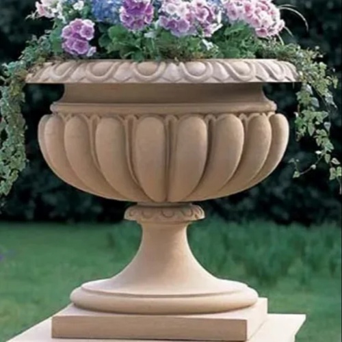 Round brown sandstone flower pot for garden use. Decorative design crafted from sandstone. Enhances outdoor garden aesthetics.