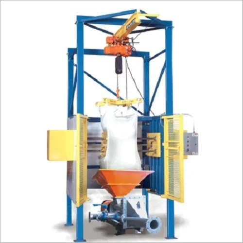 Jumbo bag debagging system designed for cement and flyash. This equipment efficiently unloads bulk bags, streamlining material handling processes for industrial applications.