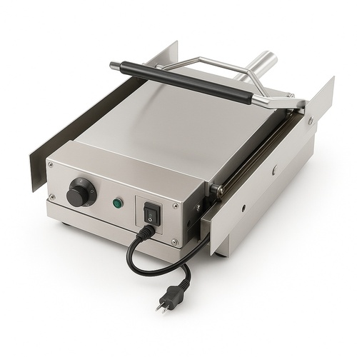 Commercial burger bun press with a capacity of 6 buns in 3-5 minutes. Operates at 50-300 Celsius, powered by 2.2kW. Weighs 28 Kg.