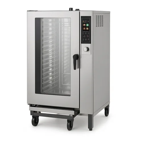 This automatic, large industrial combi steamer oven is constructed from stainless steel with a single door. It is suitable for bakery applications and pizza baking.