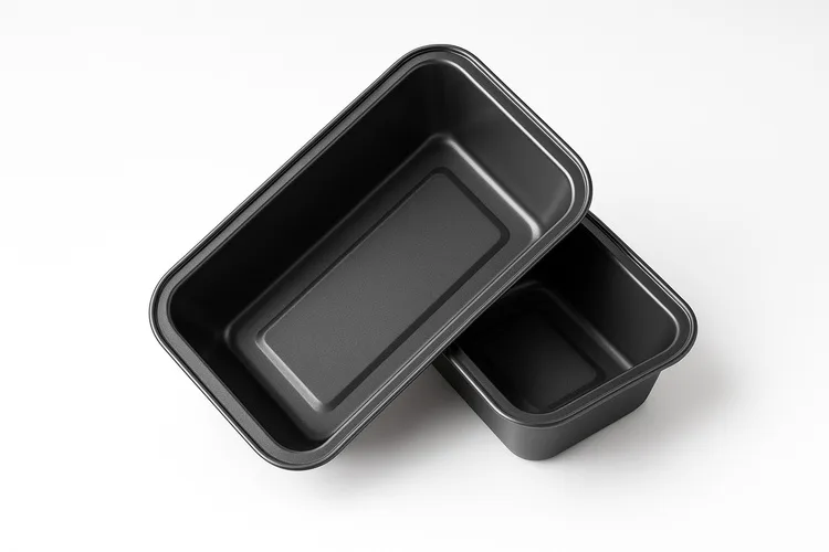 Black carbon steel loaf pan with non-stick coating. Square shape, designed for efficient bread baking. Sturdy construction, shipped in a box.