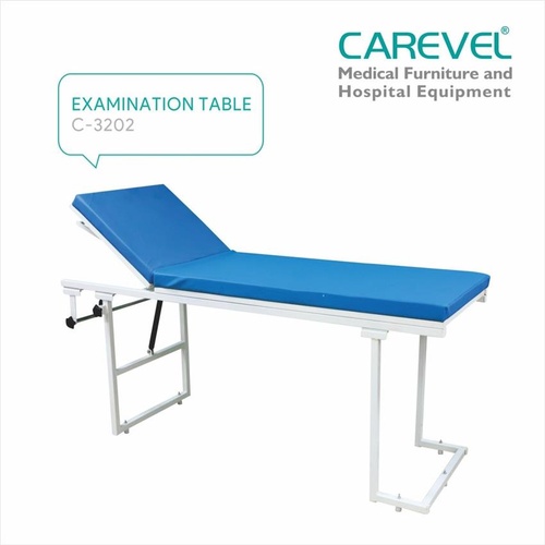 Blue Carevel C 3202 examination table for hospitals. Non-folded, overall dimensions are 1810 X 610 X 810 mm. Reliable medical equipment.