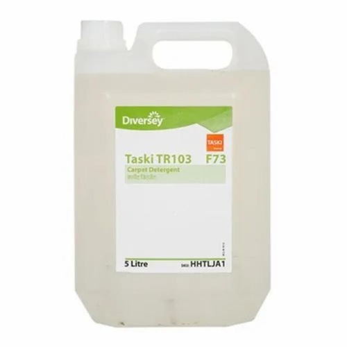 Taski TR103 F73 carpet detergent in a 5-litre pack. This liquid formula is designed for effective carpet cleaning applications. Ideal for professional use.