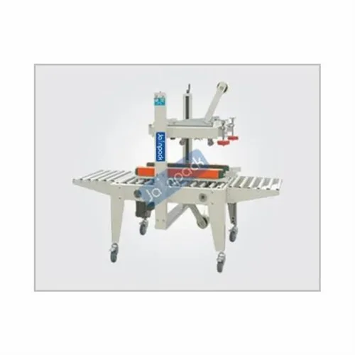 This carton sealing machine handles smaller cartons from 100 x 100 mm to 400 x 400 mm, with overall dimensions of 1730 x 950 mm and a weight of 115 Kg.