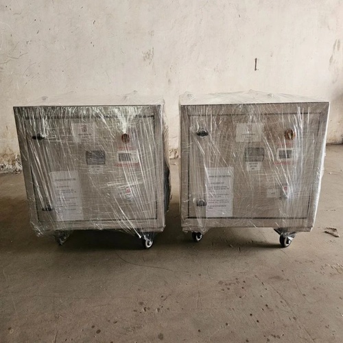Silver cashew ultrasonic humidifier with 10 LPH capacity. Features humidity control, powered by 230vac, weighing 25kg. Ideal for industrial use, made in India.