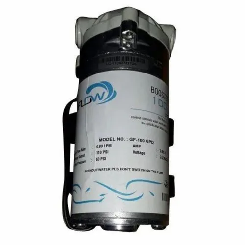 Cast iron electric booster pump. Operates on 24/36 VDC, delivering 0.80 LPM flow rate. Inlet pressure 60 PSI, output 110 PSI.
