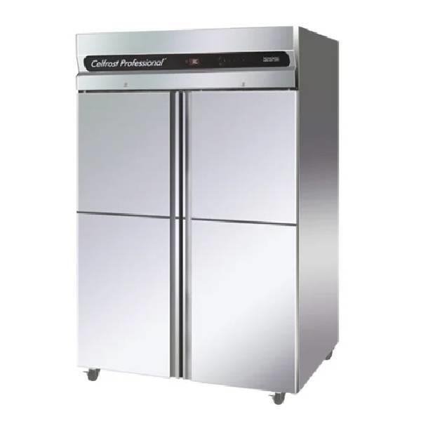 Stainless steel 4-door refrigerator with 1200L capacity. Operates on 220-380V electric power, 800W. Temperature range 2-80°C. Dimensions: 1340x800x2010 mm.