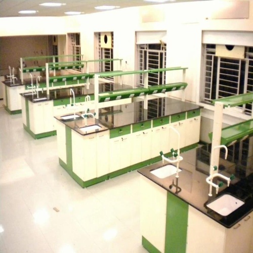 L-shaped chemical lab furniture in white with a matt finish. 22 mm thickness, suitable for lab usage. Minimum order quantity of 1. Made in India.