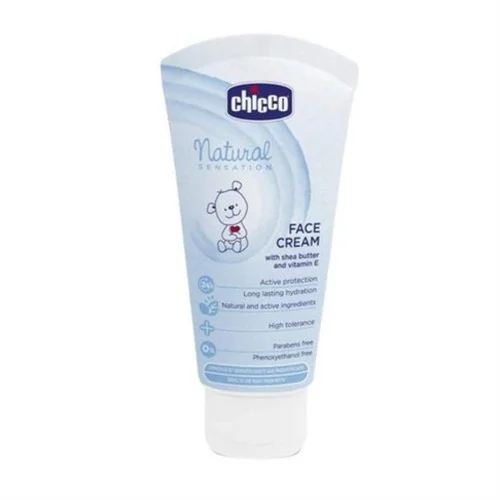 Chicco baby face cream for newborns. 50ml packaging with shea butter and vitamin E for long-lasting hydration. Free from parabens.