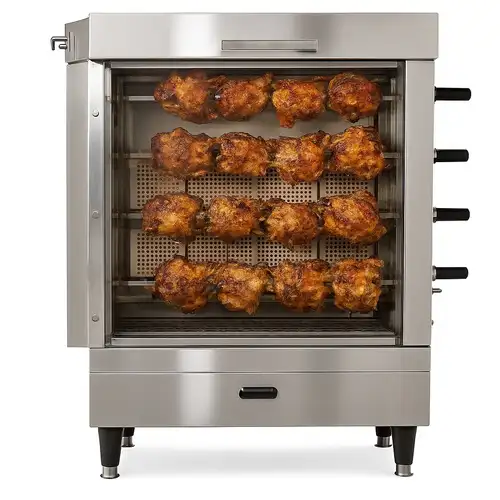 This professional chicken rotating machine features a durable build for consistent cooking. Ideal for high-volume kitchens, it ensures evenly cooked poultry with a capacity for multiple chickens.