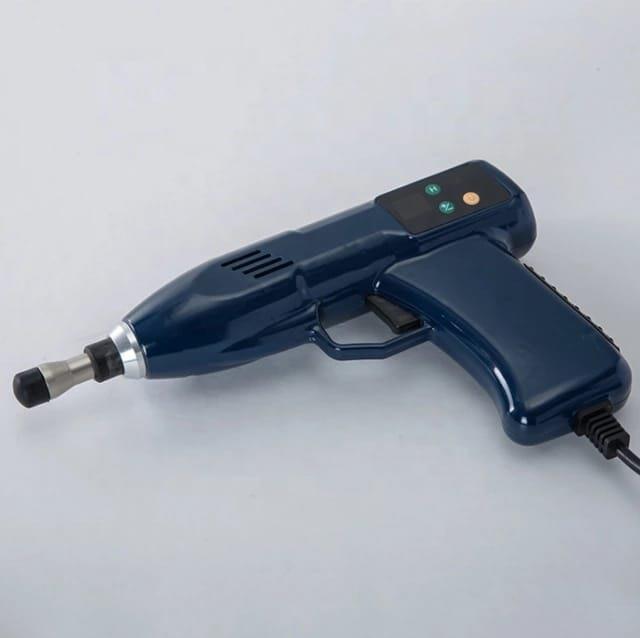 Blue chiropractic spine adjuster massager gun. Made of Mattle+Fiber for pain relief. Ergonomic gun shape for effective application.