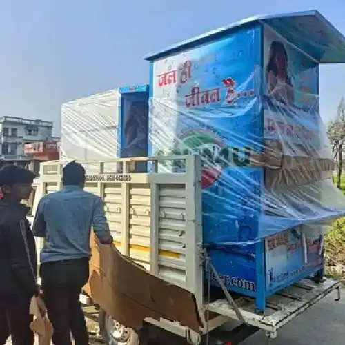 Earth mount coin-operated water machine providing R.O. pure cold water. Constructed from stainless steel/MS for durability. Ideal for dispensing purified drinking water.