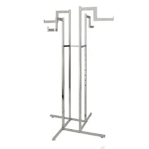 Color coated iron four-way garment stand. Suitable for shops, stores, and malls. Durable iron construction ensures stability for various display needs.