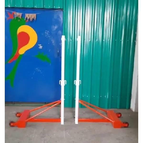 Movable badminton post made from cast iron with a color-coated surface finish. Adjustable height range of 5-6 feet for versatile play. Durable and stable design.