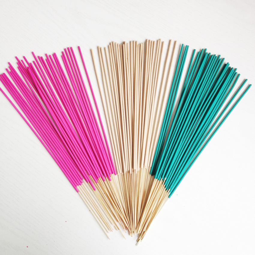 Color agarbatti sticks, 8 & 9 inches, made from bamboo. Offers 40 minutes burn time. Packaged in 30 KGS. Made in India.