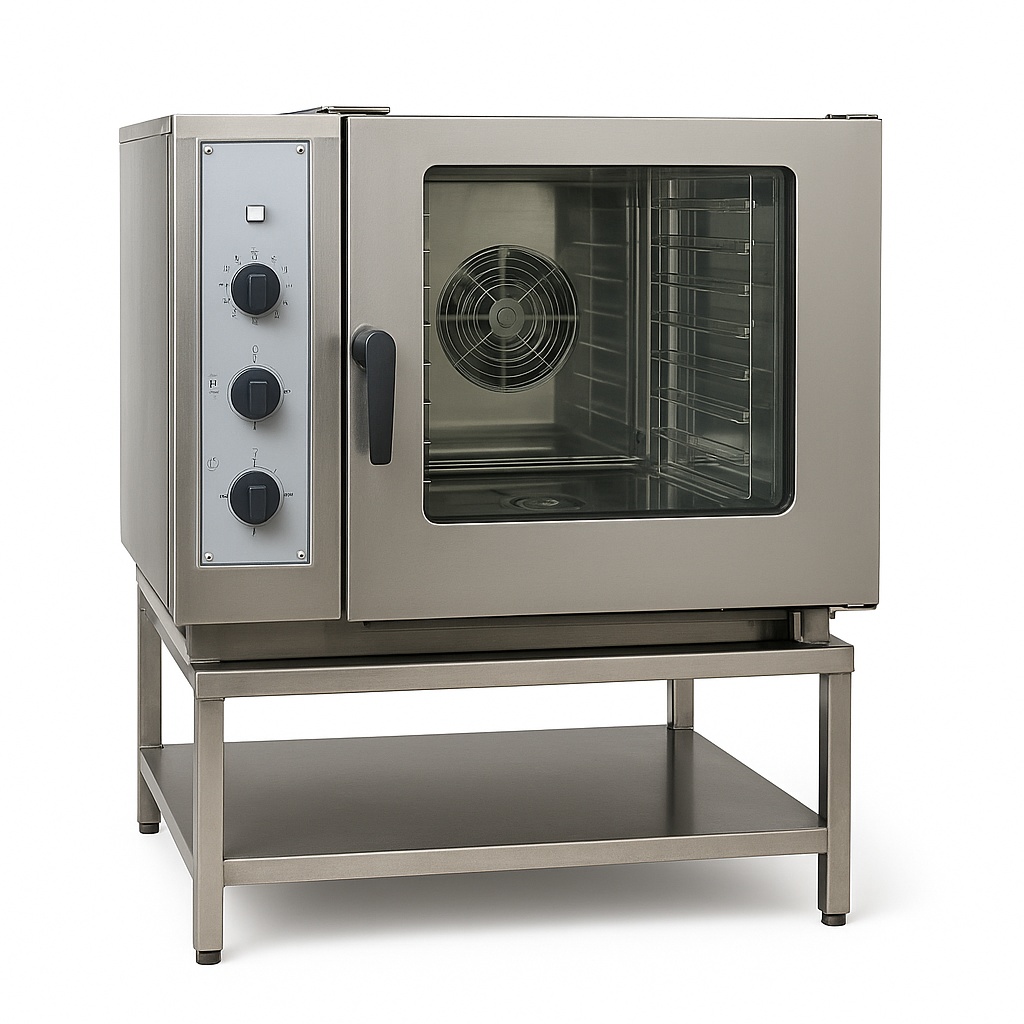 A combi oven steamer unit designed for professional kitchen use. This versatile equipment combines convection and steam cooking for efficient food preparation.