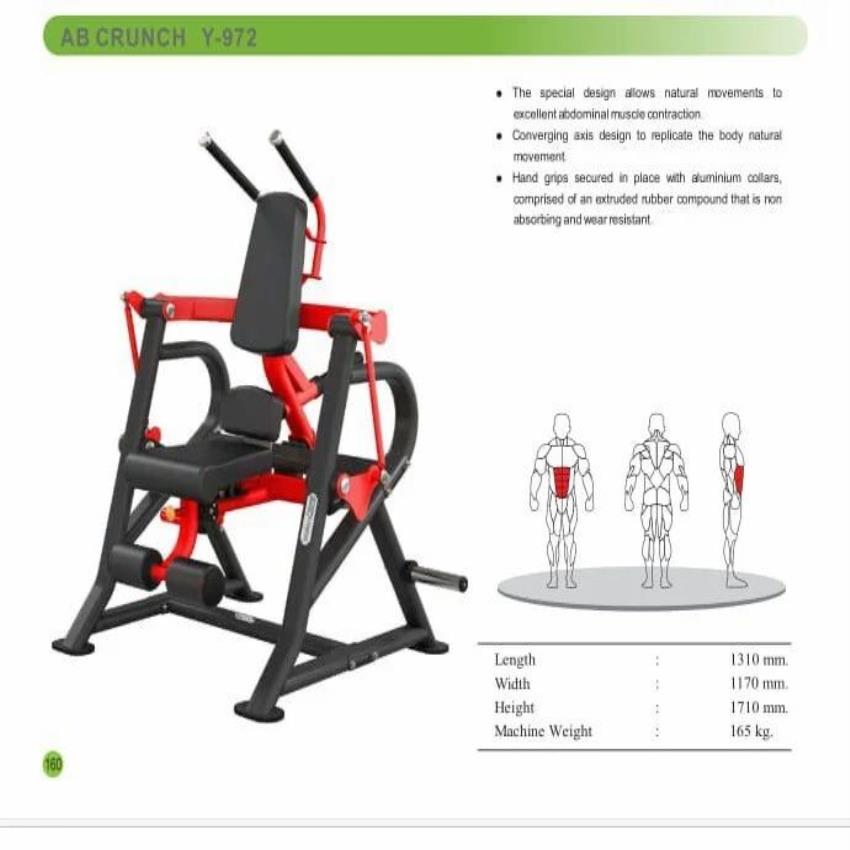 This commercial-grade fitness machine targets abdominal muscles. It weighs 120kg and is designed for professional gym use. Model Y Series.
