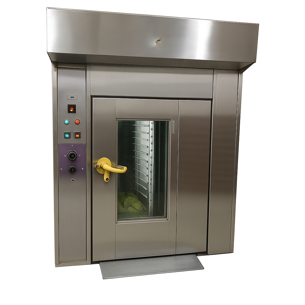 Automatic stainless steel rusk making machine for commercial use. Features 380V, 3-phase, 50Hz, 300 Kg/h capacity, and 72 trays with 0-300°C temp range.
