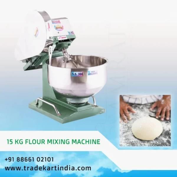 Automatic single-phase commercial mixing machine. Mixes 15 kg in 10 minutes with a 1 hp motor. Stainless steel contact parts, 2.2 kwh consumption.