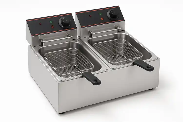 SS Deep Fryer Machine for restaurant use. Features automatic operation, powder-coated finish, 50 Hz frequency, and 240 V voltage. 30 Kg weight with 1-year warranty.