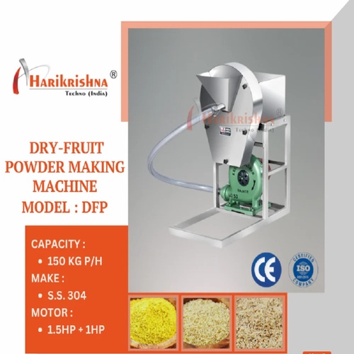 Semi-automatic commercial dry-fruit powder machine with stainless steel components. Delivers 60 kg/hr production capacity using 2 HP + 0.35 HP power consumption at 50 Hz.