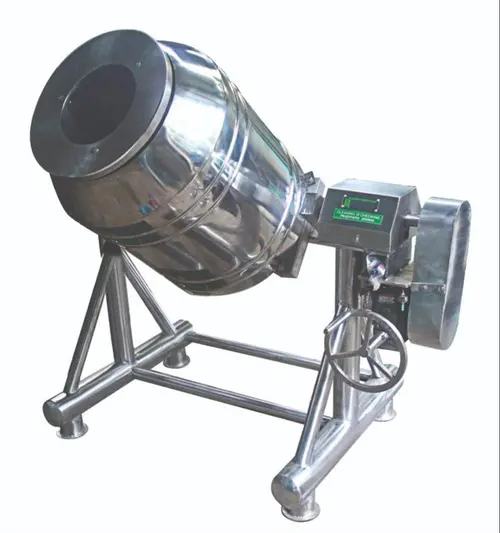 Three-phase semi-automatic electric drum roaster with 100 kg per hour capacity. Constructed from stainless steel and requires 10 HP power.