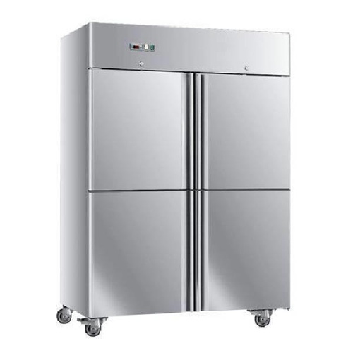 This commercial four-door refrigerator operates on 240V, 50 Hz. Features durable stainless steel body construction and four wheels for mobility.